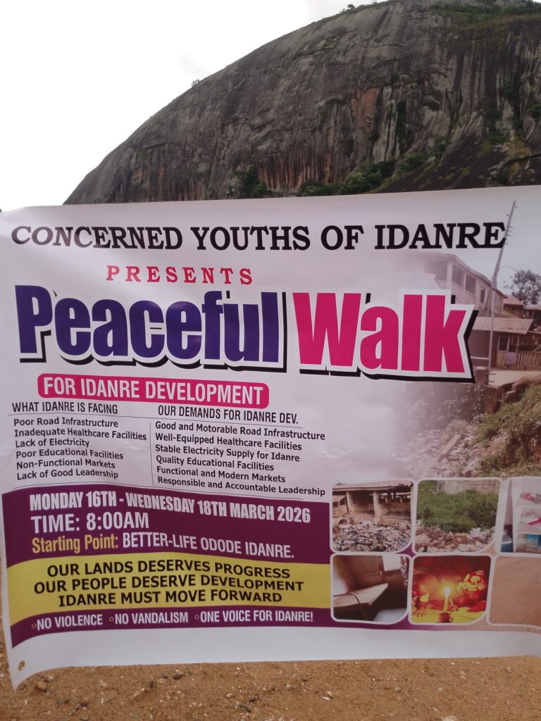Concerned youths in Idanre, Ondo State, on Monday staged a peaceful protest to demand improved infrastructure and transparent governance in the community.