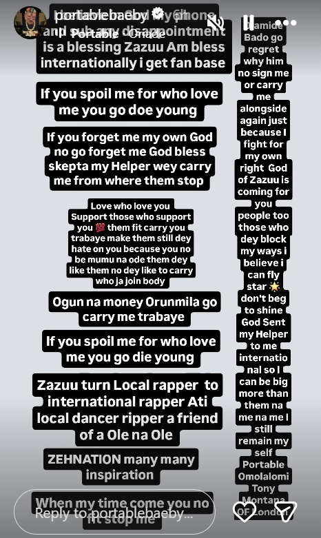 As social media buzzes with reactions, one thing is clear Portable remains a disruptor in Nigeria’s music scene, unafraid to speak his truth, stir the pot, and chase what he believes is his divine calling.